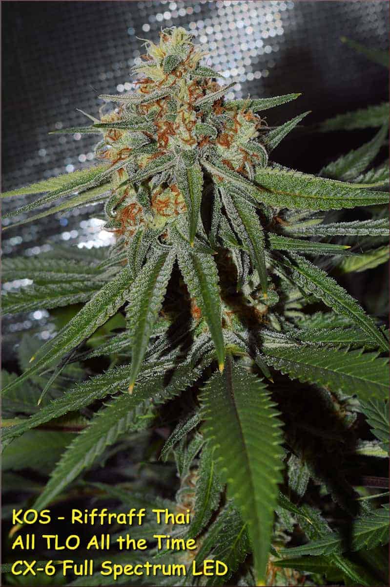 The Riffraff Thai basically has two main phenotypes, with some sub-variants within those two phenotypes. The first one leans on the indica side fairly heavy, in looks and effects. Huge yielding with fat colas, super dense; and just dripping with resin. The other phenotype I call the โKali Phenoโ and she represents a much higher sativa influence in her looks and her resin profile. Seriously spacey and intense. She normally goes 77 days, while the more indica type pheno goes 70 days.